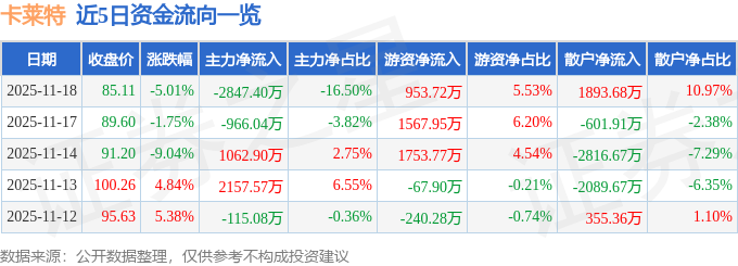 证券之星消息,截至2025年11月18日收盘,卡莱特(301391)报收于85.11元,下跌5.01%,换手率4.08%,成交量2.01万手,成交额1.73亿元。