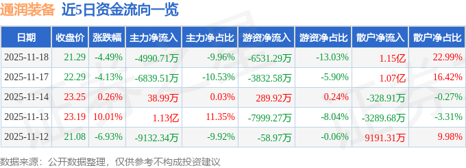 证券之星消息,截至2025年11月18日收盘,通润装备(002150)报收于21.29元,下跌4.49%,换手率6.49%,成交量23.28万手,成交额5.01亿元。