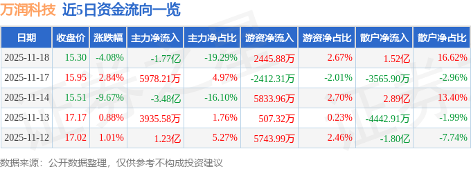 证券之星消息,截至2025年11月18日收盘,万润科技(002654)报收于15.3元,下跌4.08%,换手率7.0%,成交量59.16万手,成交额9.16亿元。