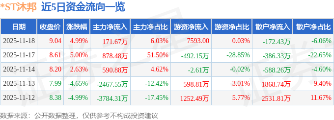 11月18日的资金流向数据方面,主力资金净流入171.67万元,占总成交额6.03%,游资资金净流入0.76万元,占总成交额0.03%,散户资金净流出172.43万元,占总成交额6.06%。