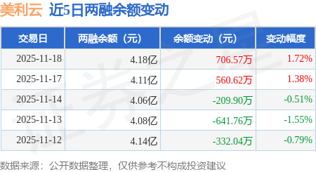 证券之星消息,11月18日,美利云(000815)融资买入1749.32万元,融资偿还1042.74万元,融资净买入706.57万元,融资余额4.18亿元。