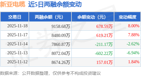 证券之星消息,11月18日,新亚电缆(001382)融资买入1116.84万元,融资偿还438.25万元,融资净买入678.59万元,融资余额9158.68万元。