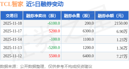 证券之星消息,11月18日,TCL智家(002668)融资买入1668.72万元,融资偿还1245.41万元,融资净买入423.31万元,融资余额4.04亿元。