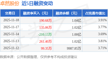 证券之星消息,11月18日,卓然股份(688121)融资买入565.29万元,融资偿还374.6万元,融资净买入190.68万元,融资余额1.04亿元。