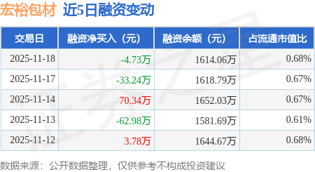 证券之星消息,11月18日,宏裕包材(920274)融资买入208.62万元,融资偿还213.34万元,融资净卖出4.73万元,融资余额1614.06万元。