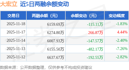 证券之星消息,11月18日,大宏立(300865)融资买入533.06万元,融资偿还648.17万元,融资净卖出115.11万元,融资余额6159.69万元。