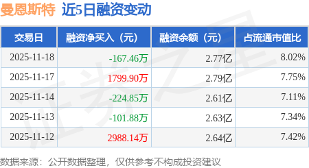 证券之星消息,11月18日,曼恩斯特(301325)融资买入2524.53万元,融资偿还2691.99万元,融资净卖出167.46万元,融资余额2.77亿元。