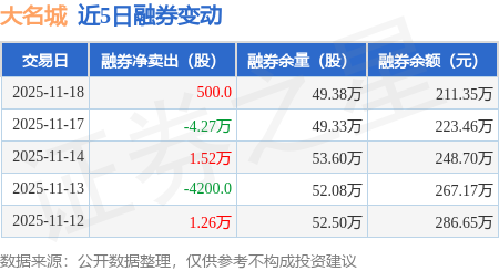证券之星消息,11月18日,大名城(600094)融资买入2713.4万元,融资偿还4253.25万元,融资净卖出1539.85万元,融资余额7.69亿元,近20个交易日中有12个交易日出现融资净买入。