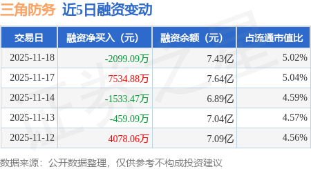 证券之星消息,11月18日,三角防务(300775)融资买入1.08亿元,融资偿还1.29亿元,融资净卖出2099.09万元,融资余额7.43亿元。