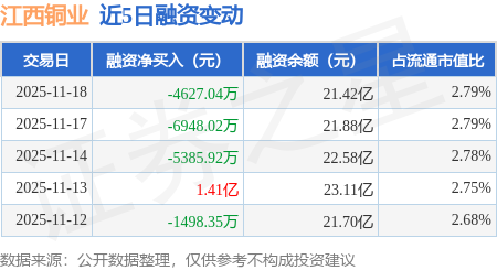 证券之星消息,11月18日,江西铜业(600362)融资买入1.39亿元,融资偿还1.85亿元,融资净卖出4627.04万元,融资余额21.42亿元。