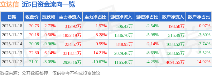 11月18日的资金流向数据方面,主力资金净流入312.92万元,占总成交额1.57%,游资资金净流出506.42万元,占总成交额2.54%,散户资金净流入193.5万元,占总成交额0.97%。