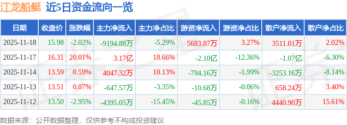 11月18日的资金流向数据方面,主力资金净流出9194.88万元,占总成交额5.29%,游资资金净流入5683.87万元,占总成交额3.27%,散户资金净流入3511.01万元,占总成交额2.02%。