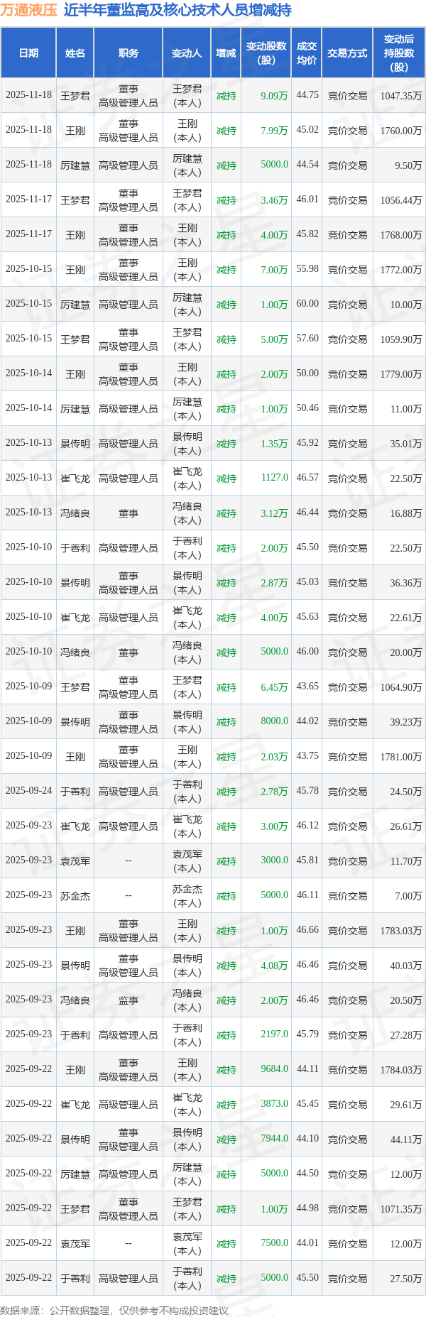 证券之星消息,根据11月19日市场公开信息、上市公司公告及交易所披露数据整理,万通液压(920839)最新董监高及相关人员股份变动情况:2025年11月17日至2025年11月18日公司董事,高级管理人员王刚、董事,高级管理人员王梦君、高级管理人员厉建慧共减持公司股份25.04万股,占公司总股本为0.2118%。变动期间公司股价下跌5.7%,11月18日当日收盘报44.82元。
