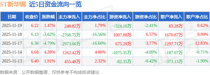 证券之星消息,截至2025年11月19日收盘,ST新华锦(600735)报收于6.22元,上涨1.47%,换手率5.13%,成交量21.82万手,成交额1.35亿元。