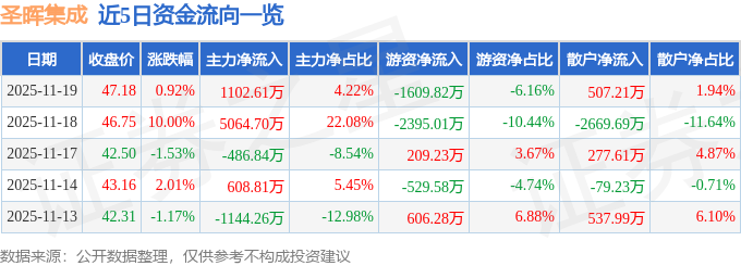 证券之星消息,截至2025年11月19日收盘,圣晖集成(603163)报收于47.18元,上涨0.92%,换手率5.48%,成交量5.48万手,成交额2.61亿元。