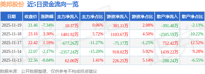 证券之星消息,截至2025年11月19日收盘,美邦股份(605033)报收于21.46元,下跌7.34%,换手率6.19%,成交量8.37万手,成交额1.84亿元。