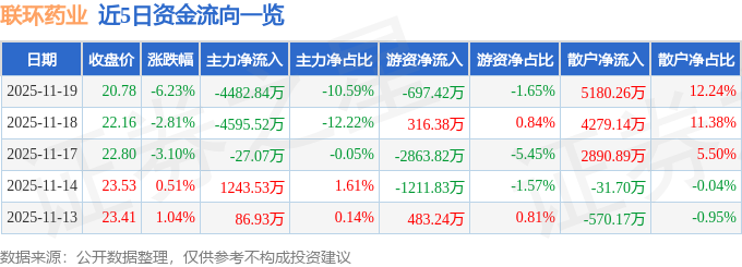 证券之星消息,截至2025年11月19日收盘,联环药业(600513)报收于20.78元,下跌6.23%,换手率7.03%,成交量20.06万手,成交额4.23亿元。