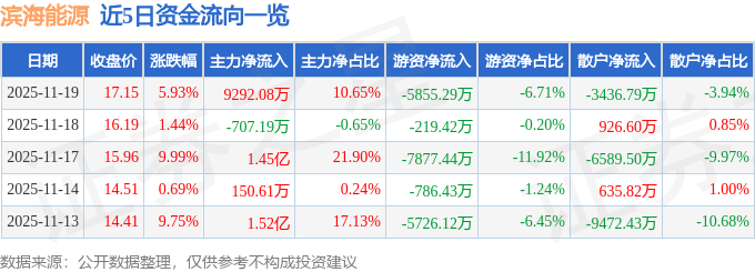 证券之星消息,截至2025年11月19日收盘,滨海能源(000695)报收于17.15元,上涨5.93%,换手率23.68%,成交量52.52万手,成交额8.72亿元。