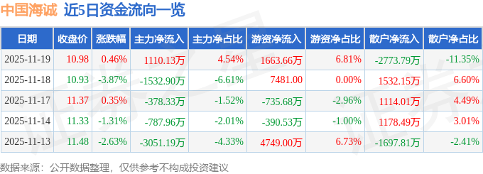 中国海诚(002116)11月19日主力资金净买入1110.13万元