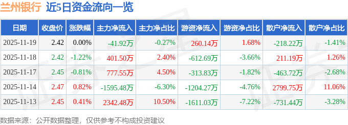 兰州银行(001227)11月19日主力资金净卖出41.92万元