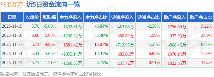 证券之星消息,截至2025年11月19日收盘,*ST万方(000638)报收于5.7元,下跌5.0%,换手率10.77%,成交量33.39万手,成交额1.95亿元。