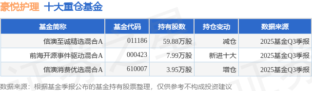 根据2025基金Q3季报公募基金重仓股数据,重仓该股的公募基金共3家,其中持有数量最多的公募基金为信达澳亚基金的信澳至诚精选混合A。信澳至诚精选混合A目前规模为3.63亿元,最新净值0.4372(11月18日),较上一交易日下跌0.09%,近一年下跌6.26%。该公募基金现任基金经理为邹运 刘维华 齐兴方。邹运在任的基金产品包括:信澳红利回报混合A,管理时间为2019年5月20日至今,期间收益率为20.72%;信澳品质回报6个月持有混合,管理时间为2021年8月23日至今,期间收益率为-44.18%。刘维华在任的基金产品包括:信澳消费优选混合A,管理时间为2021年2月11日至今,期间收益率为-45.87%;齐兴方在任的基金产品包括:信澳领先增长混合A,管理时间为2021年12月17日至今,期间收益率为-8.96%;信澳先进智造股票型A,管理时间为2022年11月14日至今,期间收益率为9.42%;信澳高端装备混合A,管理时间为2025年11月11日至今,期间收益率为-0.01%。