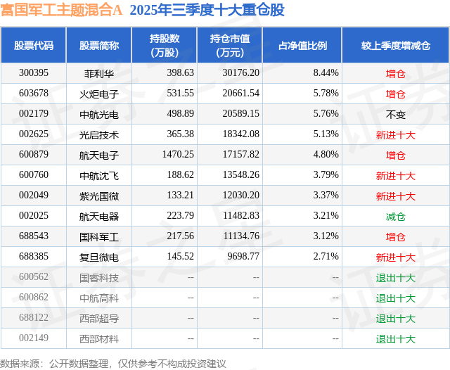 根据2025基金Q3季报公募基金重仓股数据,重仓该股的公募基金共1家,其中持有数量最多的公募基金为富国基金的富国军工主题混合A。富国军工主题混合A目前规模为30.7亿元,最新净值1.462(11月18日),较上一交易日下跌0.81%,近一年上涨5.48%。该公募基金现任基金经理为孟浩之。孟浩之在任的基金产品包括:富国创新发展两年定开混合A,管理时间为2022年1月26日至今,期间收益率为33.39%;富国产业驱动混合A,管理时间为2023年2月9日至今,期间收益率为8.8%;富国积极成长一年定开混合,管理时间为2025年9月5日至今,期间收益率为3.09%。