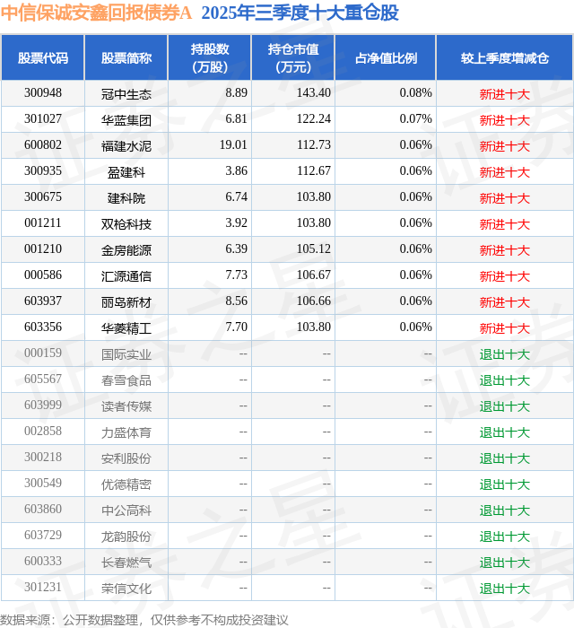 根据2025基金Q3季报公募基金重仓股数据,重仓该股的公募基金共1家,其中持有数量最多的公募基金为中信保诚基金的中信保诚安鑫回报债券A。中信保诚安鑫回报债券A目前规模为3.68亿元,最新净值1.1462(11月18日),较上一交易日下跌0.04%,近一年上涨7.44%。该公募基金现任基金经理为陈岚 王颖。王颖在任的基金产品包括:中信保诚新锐混合A,管理时间为2020年1月8日至今,期间收益率为39.29%;中信保诚中证500指数增强A,管理时间为2024年6月21日至今,期间收益率为52.85%;中信保诚瑞丰6个月混合A,管理时间为2025年2月25日至今,期间收益率为2.1%;中信保诚多策略混合(LOF)A,管理时间为2025年8月20日至今,期间收益率为6.91%。陈岚在任的基金产品包括:中信保诚景华A,管理时间为2023年12月12日至今,期间收益率为8.3%;中信保诚景瑞债券A,管理时间为2024年2月19日至今,期间收益率为6.69%;中信保诚嘉丰一年定开债发起式,管理时间为2024年5月15日至今,期间收益率为3.72%。