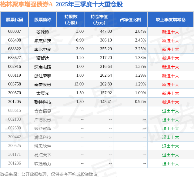 根据2025基金Q3季报公募基金重仓股数据,重仓该股的公募基金共3家,其中持有数量最多的公募基金为格林基金的格林聚享增强债券A。格林聚享增强债券A目前规模为1.57亿元,最新净值1.1439(11月18日),较上一交易日下跌0.01%,近一年上涨4.16%。该公募基金现任基金经理为冯翰尊。冯翰尊在任的基金产品包括:格林聚合增强债券A,管理时间为2023年11月21日至今,期间收益率为19.15%;格林泓远纯债A,管理时间为2024年4月3日至今,期间收益率为5.89%;格林泓盛一年定开债券发起式,管理时间为2024年4月3日至今,期间收益率为3.71%。