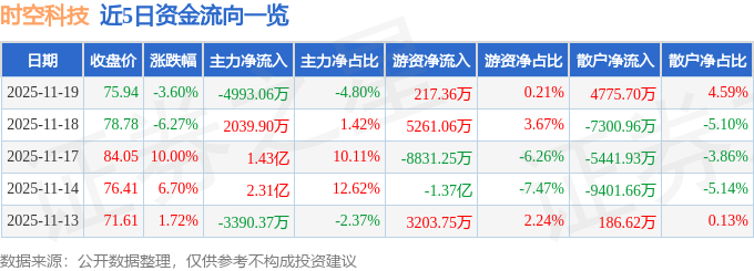 证券之星消息,截至2025年11月19日收盘,时空科技(605178)报收于75.94元,下跌3.6%,换手率13.73%,成交量13.6万手,成交额10.4亿元。