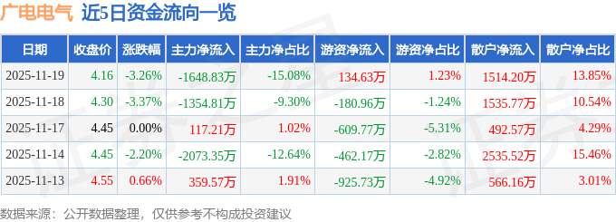 证券之星消息,截至2025年11月19日收盘,广电电气(601616)报收于4.16元,下跌3.26%,换手率3.05%,成交量26.02万手,成交额1.09亿元。