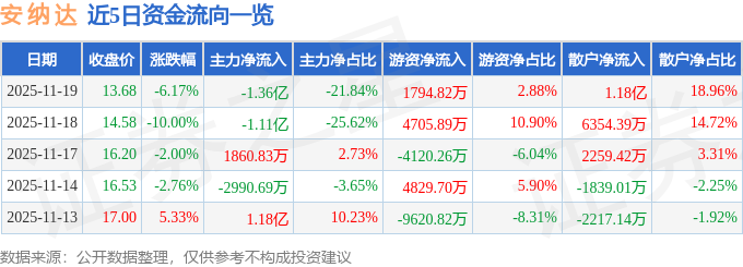 证券之星消息,截至2025年11月19日收盘,安 纳 达(002136)报收于13.68元,下跌6.17%,换手率20.94%,成交量44.91万手,成交额6.23亿元。