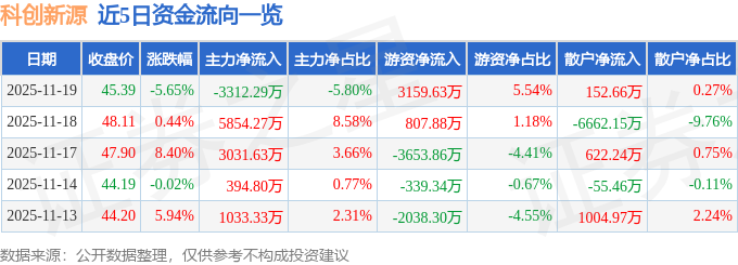 证券之星消息,截至2025年11月19日收盘,科创新源(300731)报收于45.39元,下跌5.65%,换手率10.28%,成交量12.35万手,成交额5.71亿元。