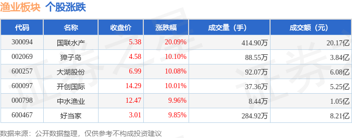 证券之星消息,11月19日渔业板块较上一交易日上涨12.24%,国联水产领涨。当日上证指数报收于3946.74,上涨0.18%。深证成指报收于13080.09,下跌0.0%。渔业板块个股涨跌见下表: