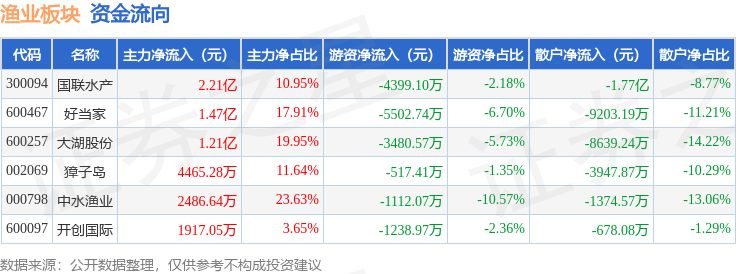 从资金流向上来看,当日渔业板块主力资金净流入5.78亿元,游资资金净流出1.63亿元,散户资金净流出4.15亿元。渔业板块个股资金流向见下表: