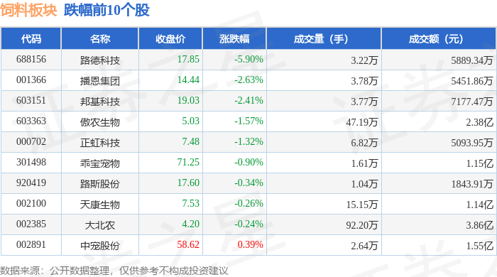 从资金流向上来看,当日饲料板块主力资金净流入1.93亿元,游资资金净流出7536.22万元,散户资金净流出1.17亿元。饲料板块个股资金流向见下表: