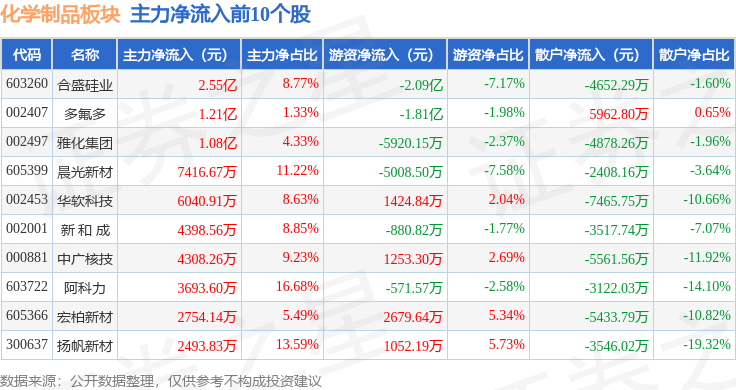 从资金流向上来看,当日化学制品板块主力资金净流出10.34亿元,游资资金净流出1.95亿元,散户资金净流入12.28亿元。化学制品板块个股资金流向见下表: