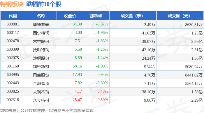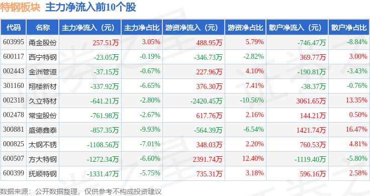 从资金流向上来看,当日特钢板块主力资金净流出1.12亿元,游资资金净流入1732.58万元,散户资金净流入9460.38万元。特钢板块个股资金流向见下表: