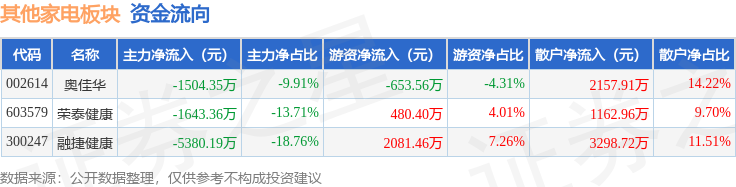 从资金流向上来看,当日其他家电板块主力资金净流出8527.89万元,游资资金净流入1908.31万元,散户资金净流入6619.59万元。其他家电板块个股资金流向见下表: