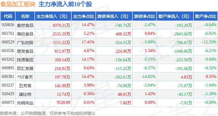 从资金流向上来看,当日食品加工板块主力资金净流出1.07亿元,游资资金净流入9158.58万元,散户资金净流入1508.11万元。食品加工板块个股资金流向见下表:
