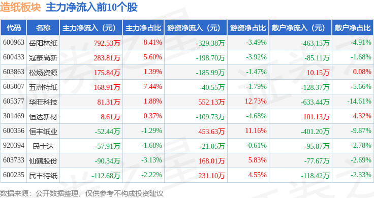 从资金流向上来看,当日造纸板块主力资金净流出2.55亿元,游资资金净流出917.36万元,散户资金净流入2.64亿元。造纸板块个股资金流向见下表:
