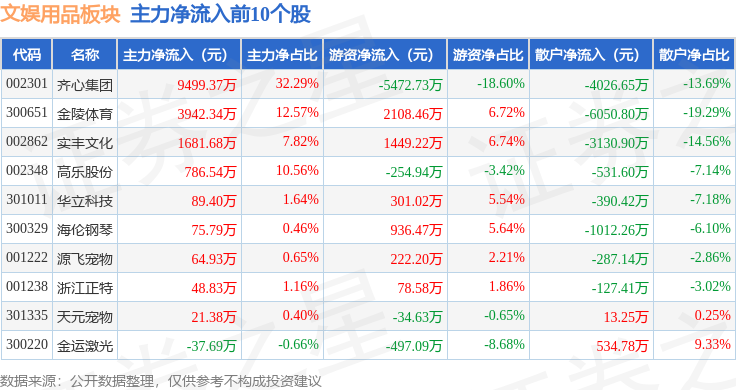 从资金流向上来看,当日文娱用品板块主力资金净流入4268.4万元,游资资金净流入2991.19万元,散户资金净流出7259.59万元。文娱用品板块个股资金流向见下表: