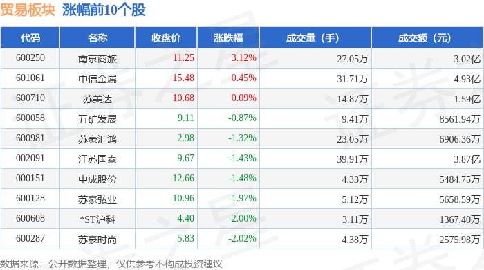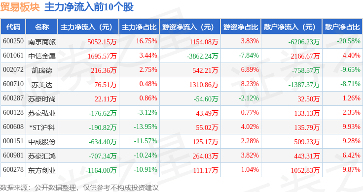 从资金流向上来看,当日贸易板块主力资金净流出5964.88万元,游资资金净流出916.23万元,散户资金净流入6881.12万元。贸易板块个股资金流向见下表: