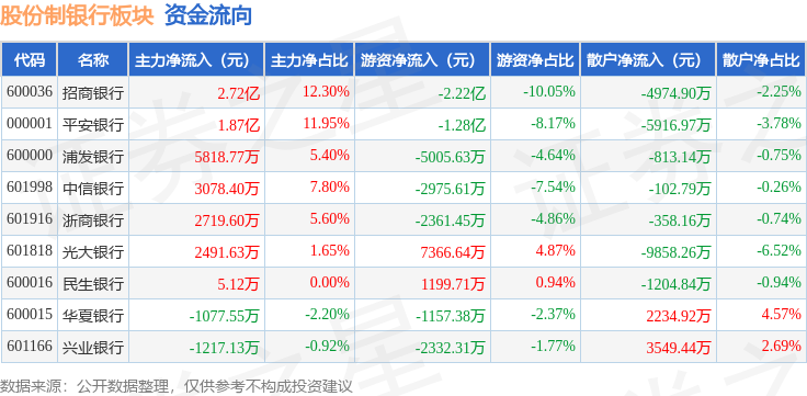 从资金流向上来看,当日股份制银行板块主力资金净流入5.77亿元,游资资金净流出4.03亿元,散户资金净流出1.74亿元。股份制银行板块个股资金流向见下表: