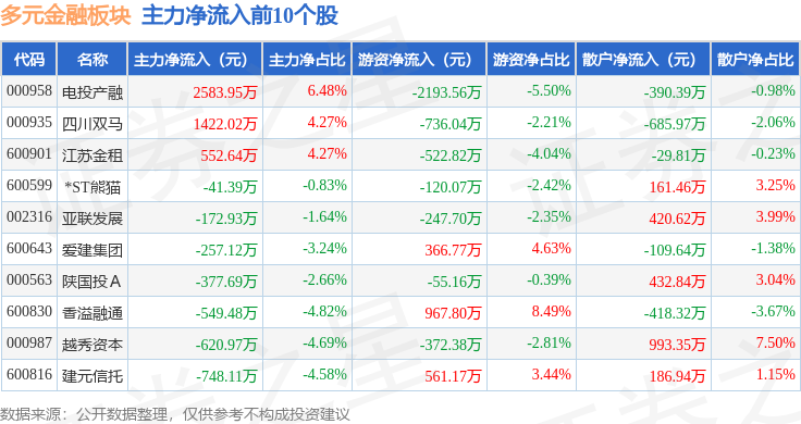从资金流向上来看,当日多元金融板块主力资金净流出7.76亿元,游资资金净流入5947.49万元,散户资金净流入7.16亿元。多元金融板块个股资金流向见下表: