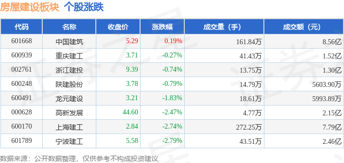 证券之星消息,11月19日房屋建设板块较上一交易日下跌0.33%,宁波建工领跌。当日上证指数报收于3946.74,上涨0.18%。深证成指报收于13080.09,下跌0.0%。房屋建设板块个股涨跌见下表: