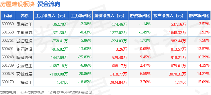 从资金流向上来看,当日房屋建设板块主力资金净流出2.46亿元,游资资金净流入3809.01万元,散户资金净流入2.08亿元。房屋建设板块个股资金流向见下表: