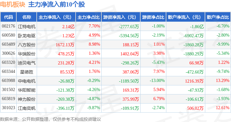 从资金流向上来看,当日电机板块主力资金净流出7030.48万元,游资资金净流出6836.32万元,散户资金净流入1.39亿元。电机板块个股资金流向见下表: