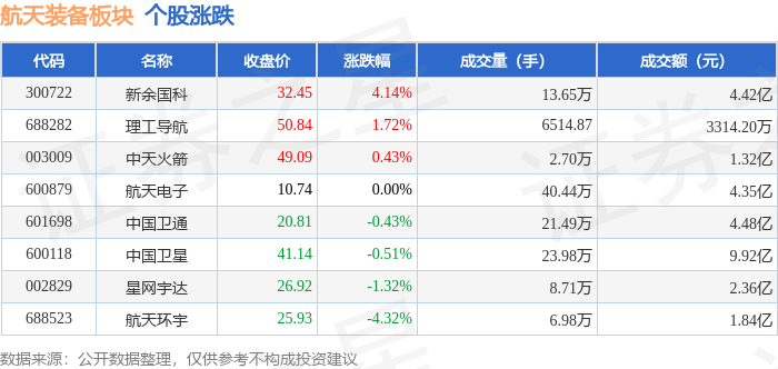 证券之星消息,11月19日航天装备板块较上一交易日下跌0.16%,航天环宇领跌。当日上证指数报收于3946.74,上涨0.18%。深证成指报收于13080.09,下跌0.0%。航天装备板块个股涨跌见下表: