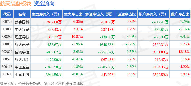 从资金流向上来看,当日航天装备板块主力资金净流出5100.38万元,游资资金净流出4258.94万元,散户资金净流入9359.32万元。航天装备板块个股资金流向见下表: